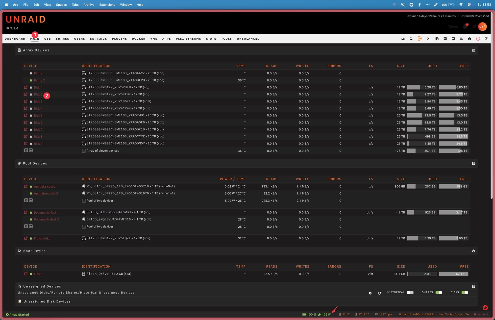 Über das Main-Tab kannst du Platten manuell “spindownen” – ein guter Test, ob alles korrekt funktioniert.